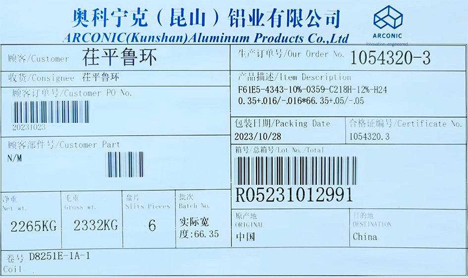 鋁帶 鋁管材料采用中美合資企業奧科寧克鋁業公司供應